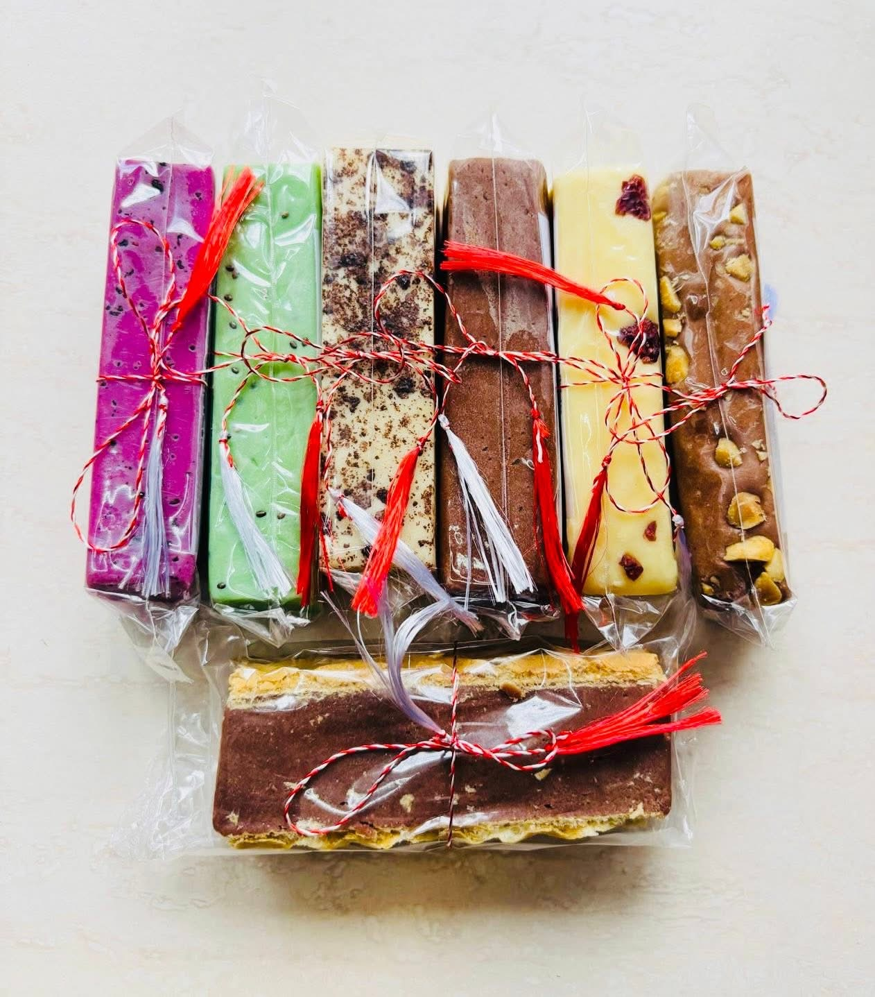 Ciocolata de casă artizanală cu sortimente unice de fructe: zmeură, banane, kiwi, afine, căpșuni, cireșe, vișine, lavandă, portocală, mandarină, lămâie, piersică, mure, pepene roșu, fructe de pădure, ananas, mango, fructul-pasiunii, cătină-turmeric, trandafir, fistic, mentă, cafea espresso, capuccino, bomboane, M&M, biscuiți Oreo, caramel, marshmallow, alune de pădure, nuci bio prăjite, arahide prăjite sărate, prune uscate, stafide, merișoare uscate, căpșuni deshidratate, afine deshidratate, gutui deshidratate, fulgi de cocos, migdale fulgi, rom autentic, vanilie de Bourbon, scorțișoară și portocală, goji, coacăze roșie, coacăze neagră.