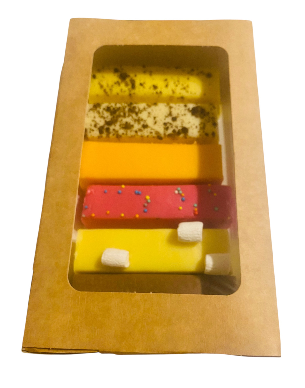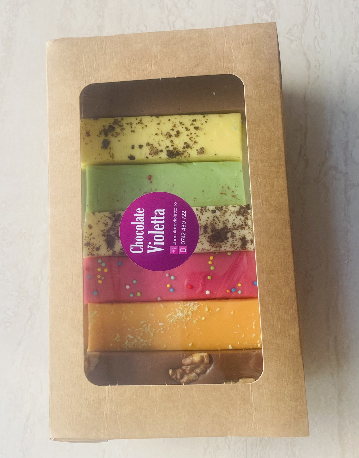 Ciocolata de casă artizanală cu sortimente unice de fructe: zmeură, banane, kiwi, afine, căpșuni, cireșe, vișine, lavandă, portocală, mandarină, lămâie, piersică, mure, pepene roșu, fructe de pădure, ananas, mango, fructul-pasiunii, cătină-turmeric, trandafir, fistic, mentă, cafea espresso, capuccino, bomboane, M&M, biscuiți Oreo, caramel, marshmallow, alune de pădure, nuci bio prăjite, arahide prăjite sărate, prune uscate, stafide, merișoare uscate, căpșuni deshidratate, afine deshidratate, gutui deshidratate, fulgi de cocos, migdale fulgi, rom autentic, vanilie de Bourbon, scorțișoară și portocală, goji, coacăze roșie, coacăze neagră.