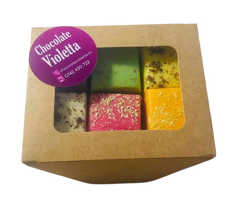 Ciocolata de casă artizanală cu sortimente unice de fructe: zmeură, banane, kiwi, afine, căpșuni, cireșe, vișine, lavandă, portocală, mandarină, lămâie, piersică, mure, pepene roșu, fructe de pădure, ananas, mango, fructul-pasiunii, cătină-turmeric, trandafir, fistic, mentă, cafea espresso, capuccino, bomboane, M&M, biscuiți Oreo, caramel, marshmallow, alune de pădure, nuci bio prăjite, arahide prăjite sărate, prune uscate, stafide, merișoare uscate, căpșuni deshidratate, afine deshidratate, gutui deshidratate, fulgi de cocos, migdale fulgi, rom autentic, vanilie de Bourbon, scorțișoară și portocală, goji, coacăze roșie, coacăze neagră.